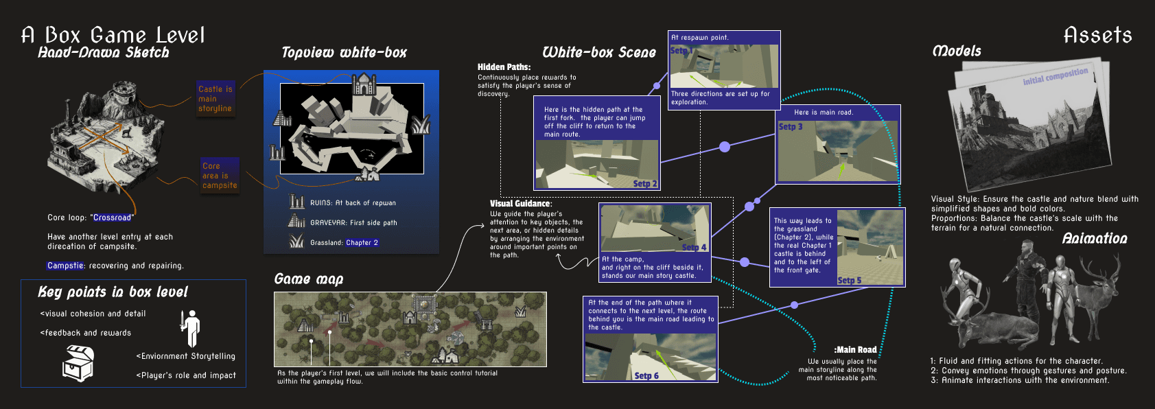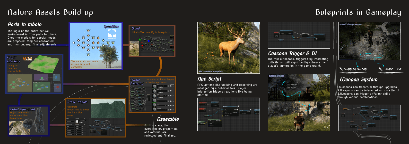 This project will develop in UE5 engine, it draws on my personal life experiences to create a game scene in a fictional myth-world. Through level design, visual guidance, beginner tutorials, and various blueprints functions, the scene is fully realized as the first level of the game.