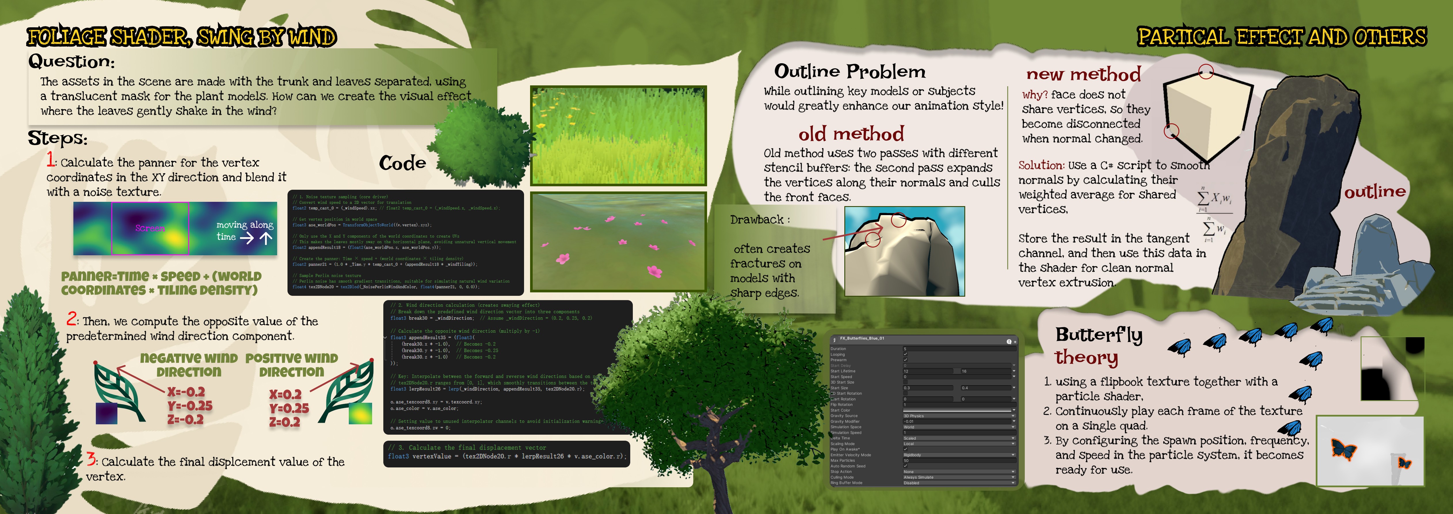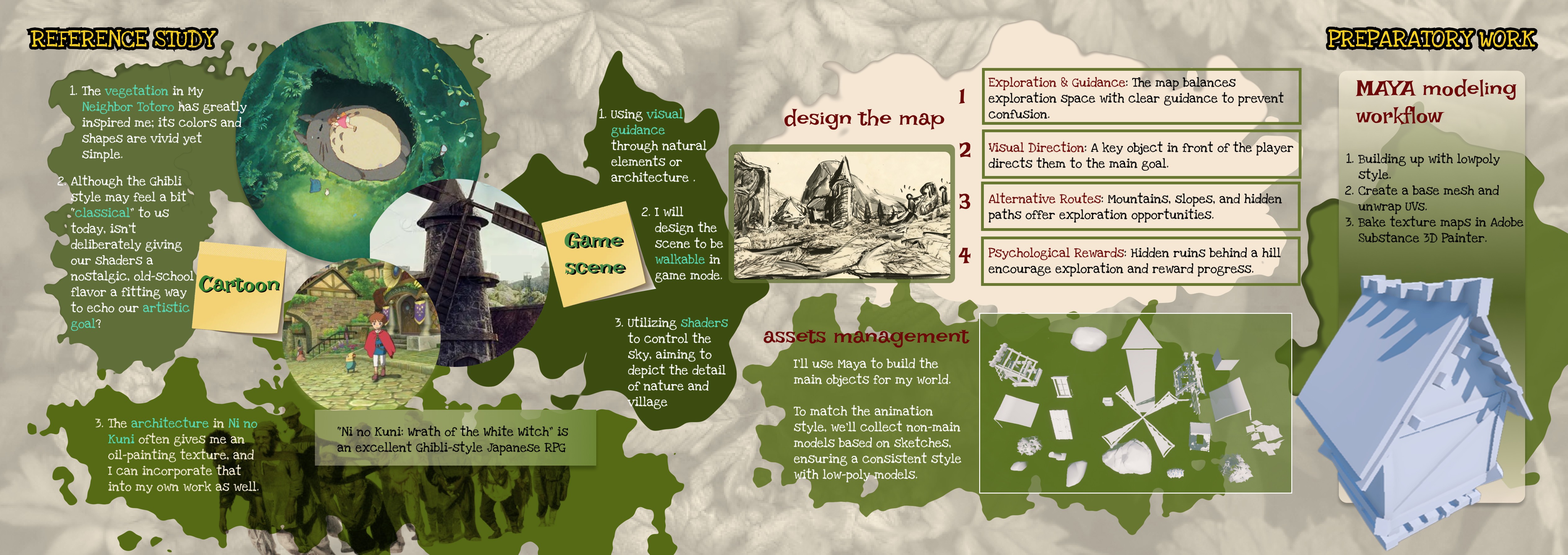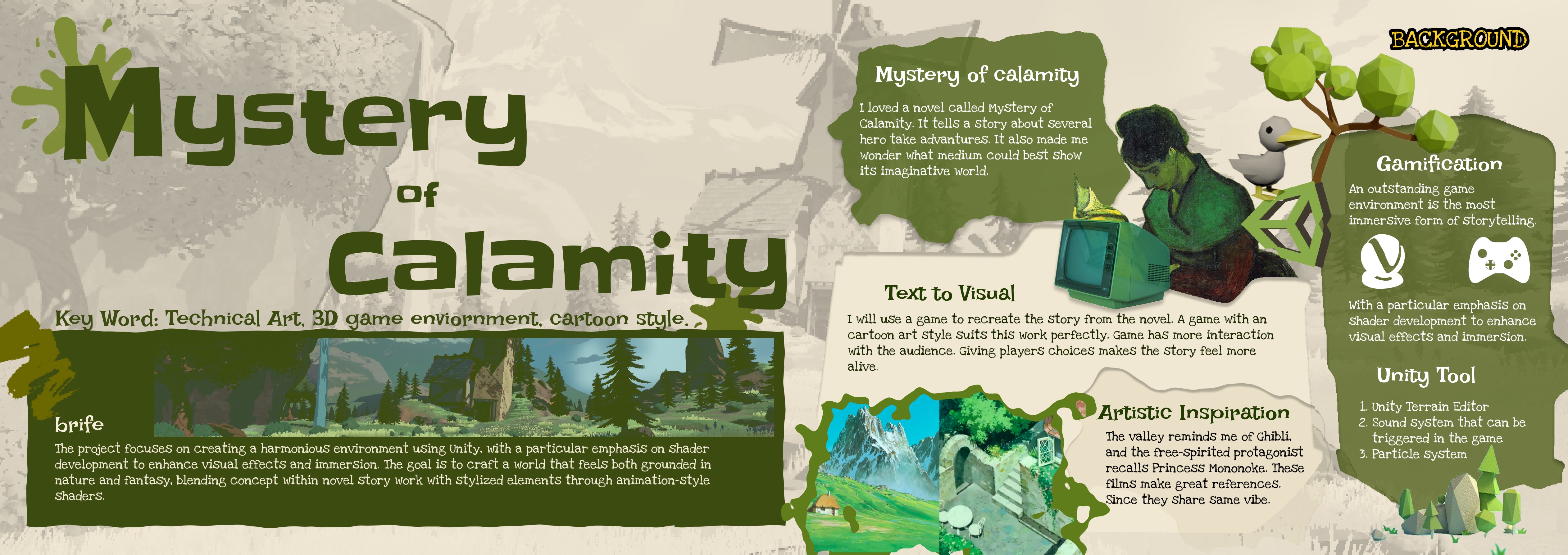 The project focuses on creating a harmonious environment using Unity, with a particular emphasis on shader development to enhance visual effects and immersion. The goal is to craft a world that feels both grounded in nature and fantasy, blending concept within novel story work with stylized elements through animation-style shaders.