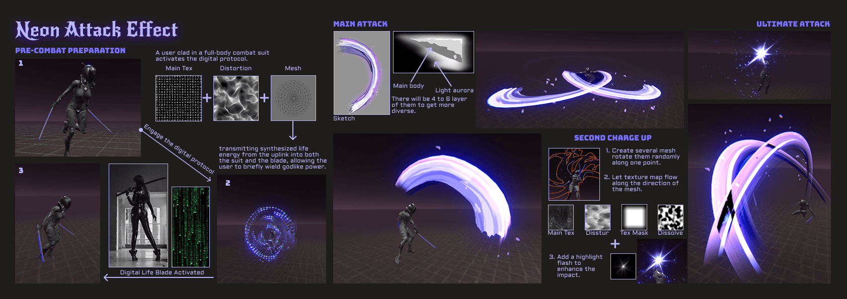 I designed three particle effects for a Monk, a Mage, and a cyber-enhanced Hunter, set in a dystopian future where a megacorporation hunts ancient immortals whose powers represent inner control and life extraction.